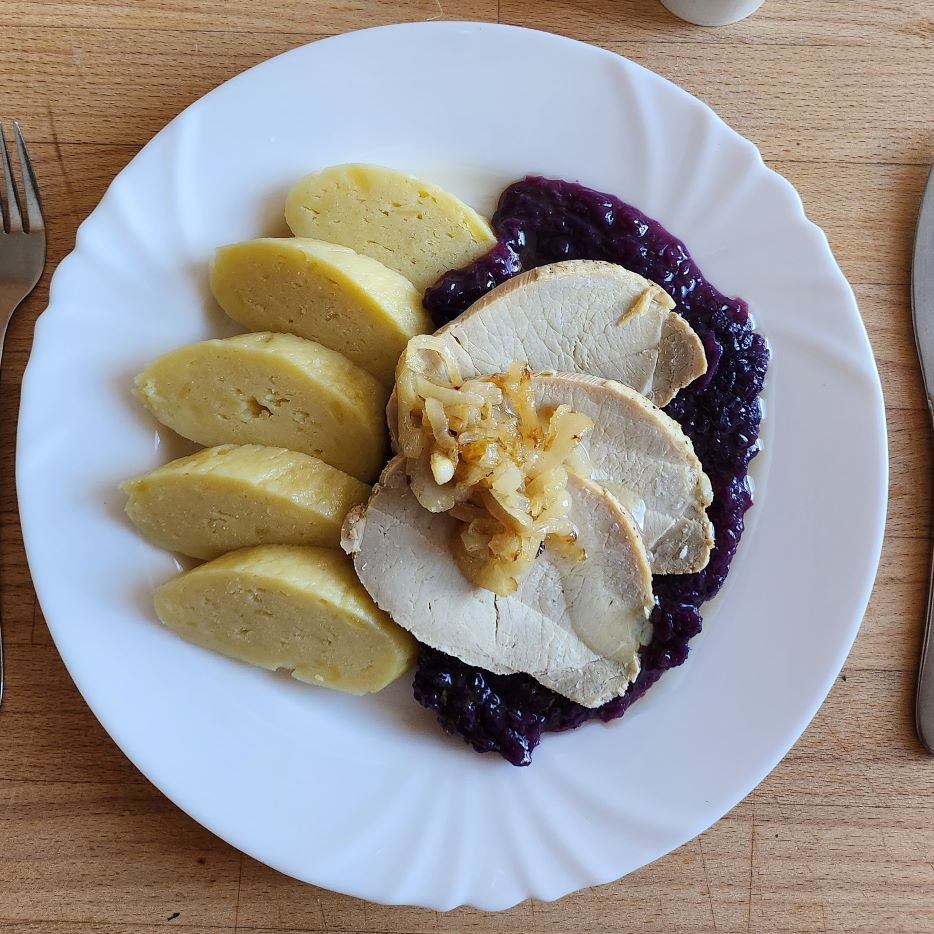 Bravčové na červenej kapuste,domáci zemiakový bezlepkový knedlík