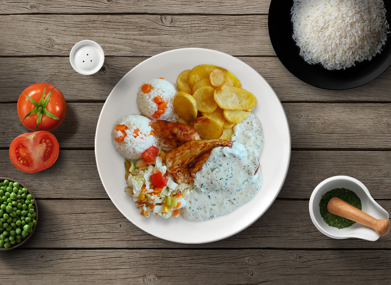 Kurací steak s bylinkovou omáčkou,mrkvová ryža,zemiakové plátky,obloha