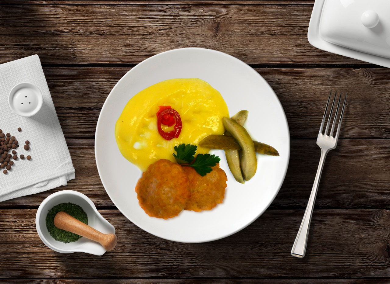 Bravčový karbonátok so syrom, zemiaková kaša,kyslá uhorka